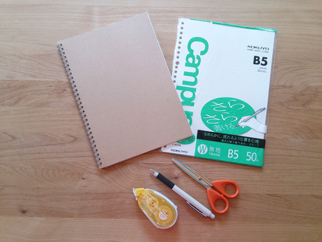 ノート・無地の紙・貼って剥がせるテープのり・ペン・はさみ。